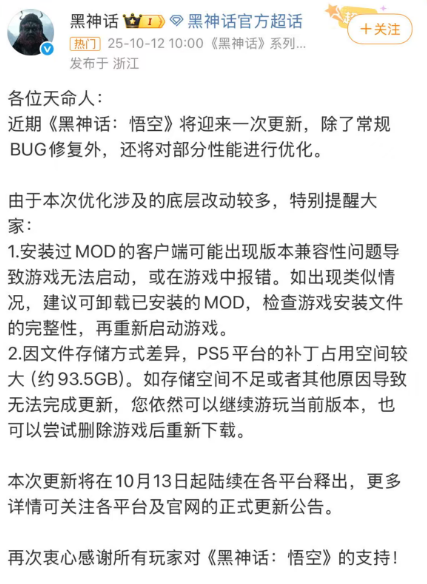 10月12日,黑神话发布微博宣布,近期《黑神话:悟空》将迎来一次更新,除了常规BUG修复外,还将对部分性能进行优化。本次更新在10月13日起陆续在各平台释出,更多详情可关注各平台及官网的正式更新公告。